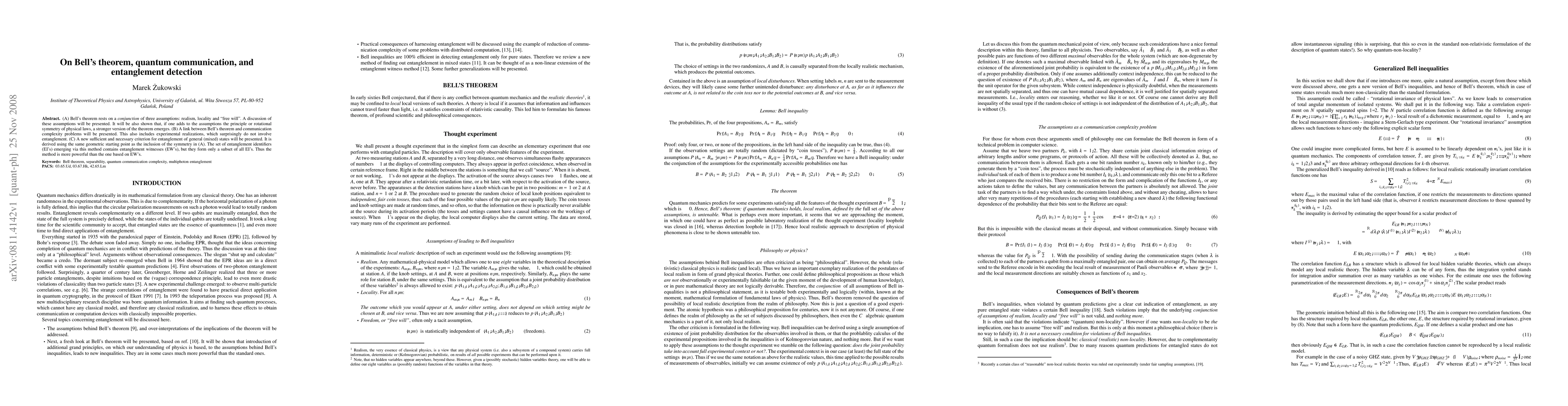 This paper discusses Bell's theorem, emphasizing its assumptions of realism, locality, and free will, and explores a stronger version when rotational symmetry is included. It also links Bell's theorem to communication complexity, highlighting experimental realizations that do not rely on entanglement. The paper introduces a new criterion for detecting entanglement in general states, which is more powerful than methods based on entanglement witnesses.