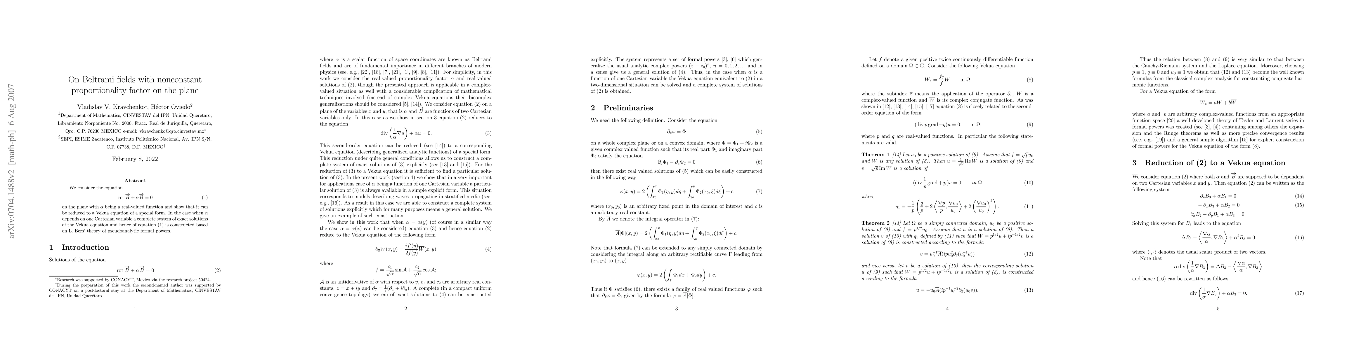 We consider the equation rotB+aB=0 (1) in the plane with a being a real-valued function and show that it can be reduced to a Vekua equation of a special form. In the case when a depends on one Cartesian variable a complete system of exact solutions of the Vekua equation and hence of equation (1) is constructed based on L. Bers' theory of formal powers.