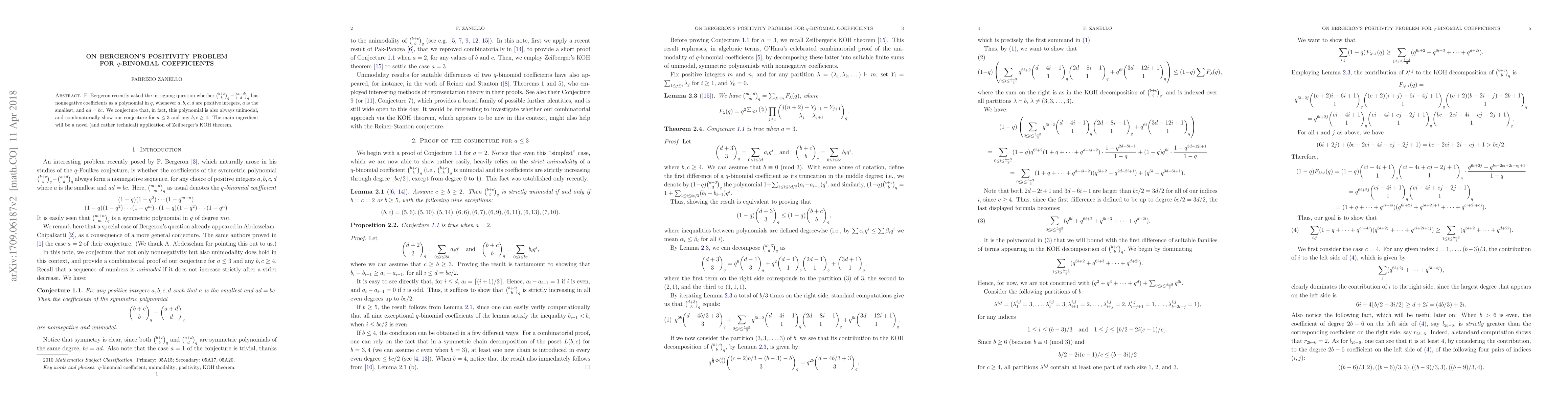 F. Bergeron recently asked the intriguing question whether $\binom{b+c}{b}_q -\binom{a+d}{d}_q$ has nonnegative coefficients as a polynomial in $q$, whenever $a,b,c,d$ are positive integers, $a$ is the smallest, and $ad=bc$. We conjecture that, in fact, this polynomial is also always unimodal, and combinatorially show our conjecture for $a\le 3$ and any $b,c\ge 4$. The main ingredient will be a novel (and rather technical) application of Zeilberger's KOH theorem.