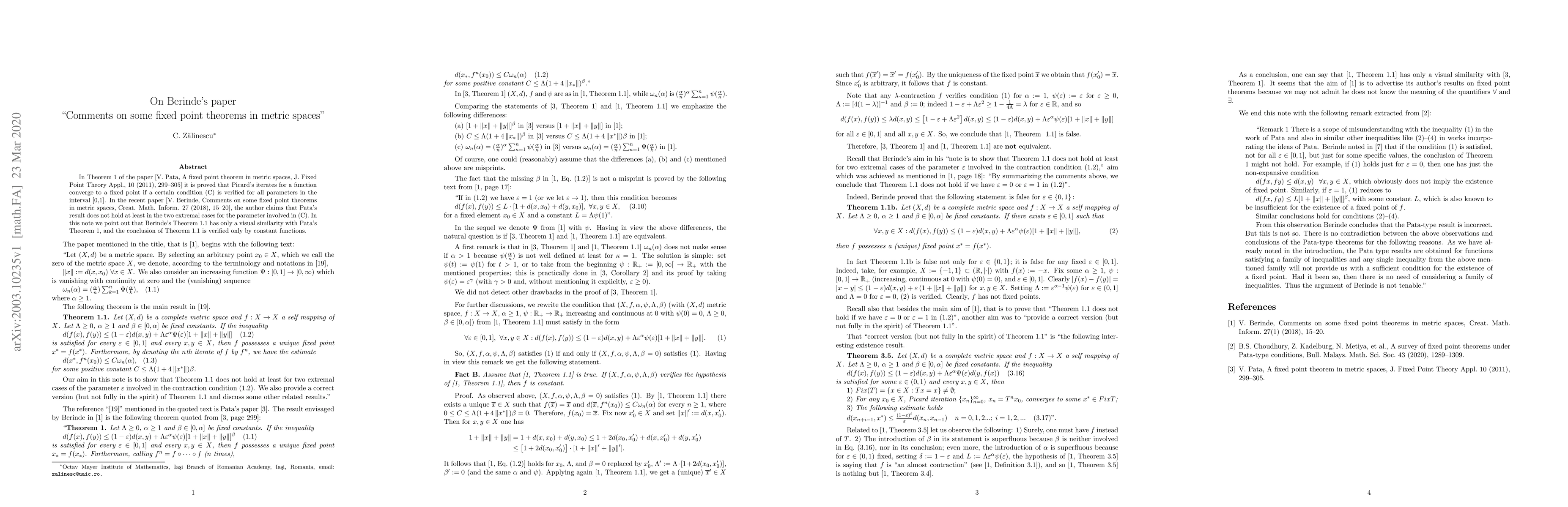 In Theorem 1 of the paper [V. Pata, A fixed point theorem in metric spaces, J. Fixed Point Theory Appl., 10 (2011), 299-305] it is proved that Picard's iterates for a function converge to a fixed point if a certain condition (C) is verified for all parameters in the interval [0,1]. In the recent paper [V. Berinde, Comments on some fixed point theorems in metric spaces, Creat. Math. Inform. 27 (2018), 15-20], the author claims that Pata's result does not hold at least in the two extremal cases for the parameter involved in (C). In this note we point out that Berinde's Theorem 1.1 has only a visual similarity with Pata's Theorem 1, and the conclusion of Theorem 1.1 is verified only by constant functions.
