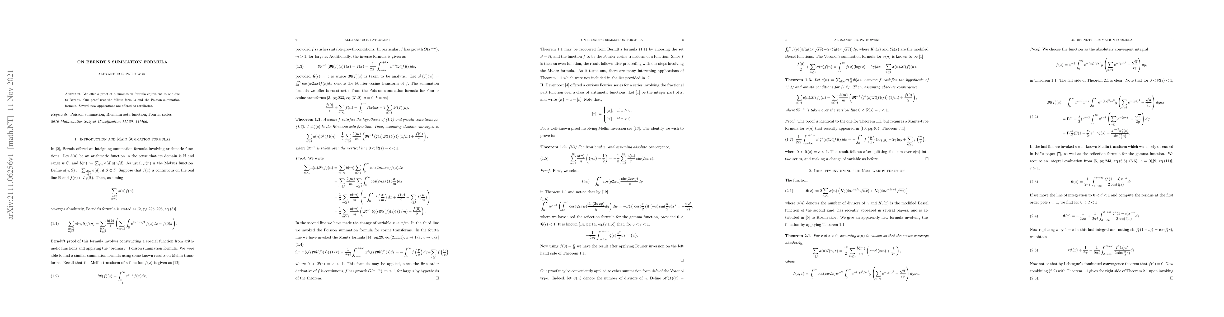 This paper provides a proof of Berndt's summation formula using the M$\ddot{u}$ntz and Poisson summation formulas, and presents several new applications as corollaries.