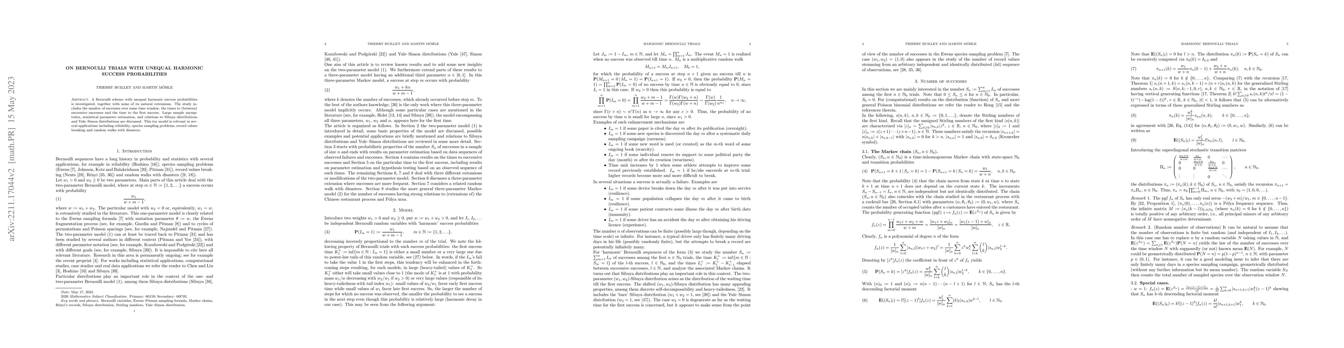 This paper investigates a Bernoulli trial model with unequal harmonic success probabilities, exploring large sample asymptotics, parameter estimation, and connections to Sibuya and Yule-Simon distributions. Applications include reliability, species sampling, and random walks with disasters.