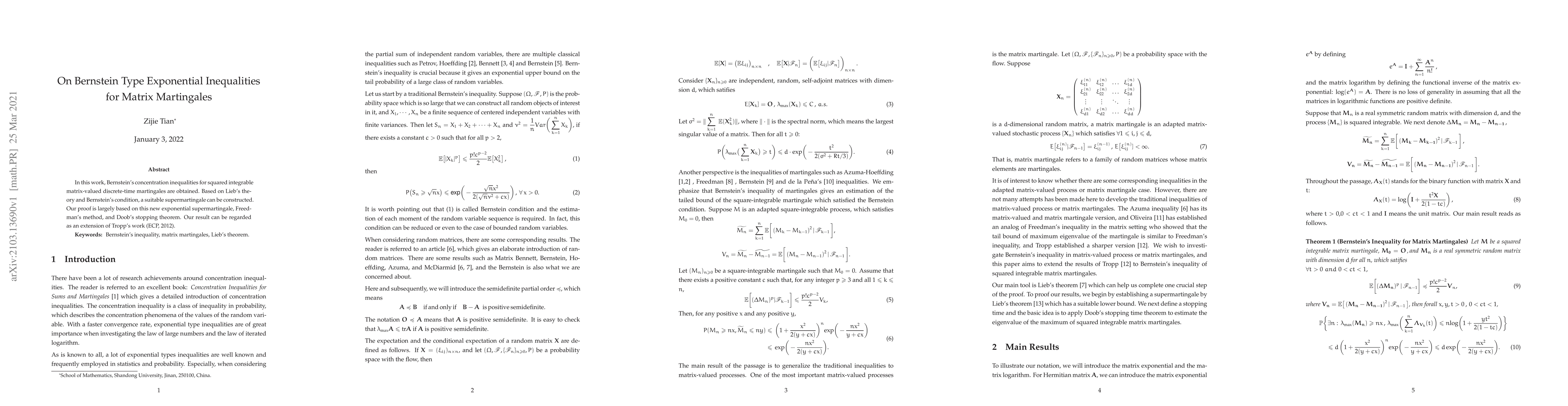 This paper derives Bernstein-type exponential inequalities for matrix-valued martingales using Lieb's theory and a new exponential supermartingale, extending Tropp's earlier results and employing techniques from Freedman and Doob.