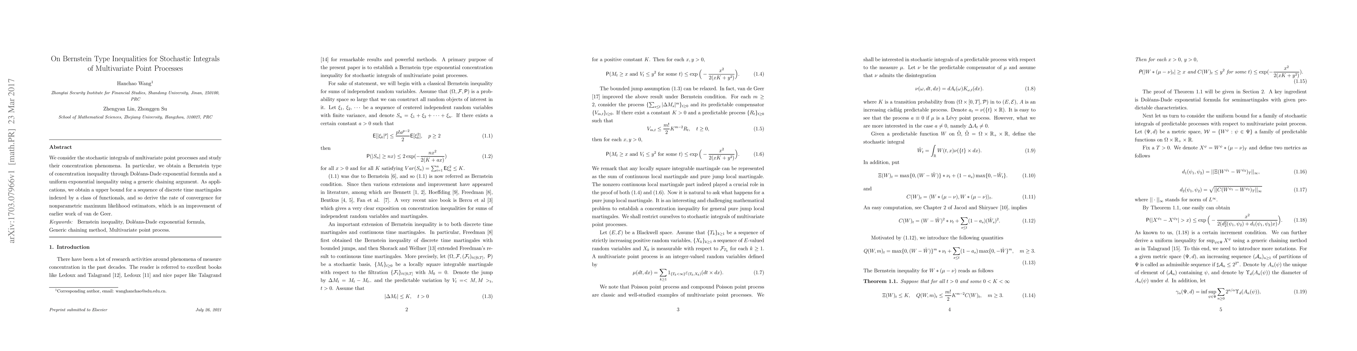We consider the stochastic integrals of multivariate point processes and study their concentration phenomena. In particular, we obtain a Bernstein type of concentration inequality through Dol\'eans-Dade exponential formula and a uniform exponential inequality using a generic chaining argument. As applications, we obtain a upper bound for a sequence of discrete time martingales indexed by a class of functionals, and so derive the rate of convergence for nonparametric maximum likelihood estimators, which is an improvement of earlier work of van de Geer.