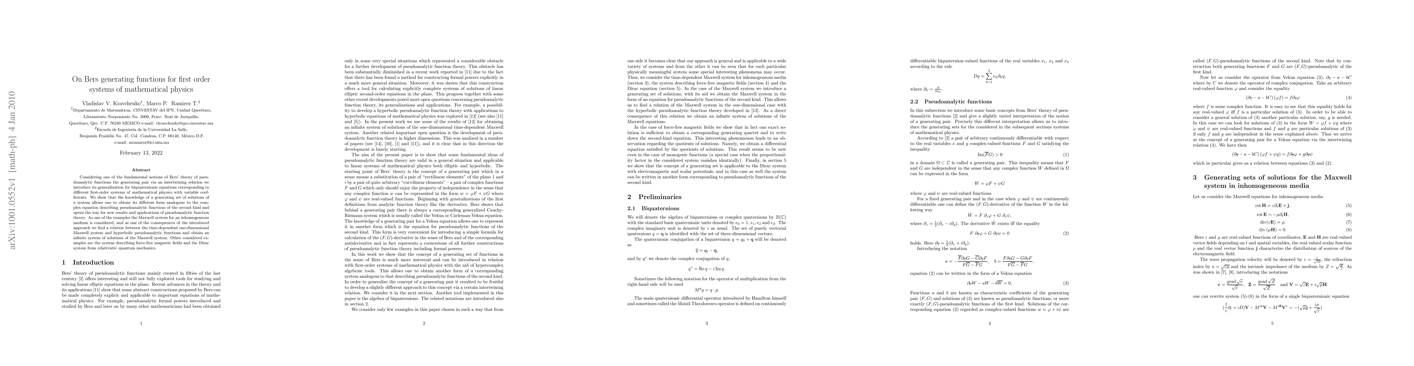 Considering one of the fundamental notions of Bers' theory of pseudoanalytic functions the generating pair via an intertwining relation we introduce its generalization for biquaternionic equations corresponding to different first-order systems of mathematical physics with variable coefficients. We show that the knowledge of a generating set of solutions of a system allows one to obtain its different form analogous to the complex equation describing pseudoanalytic functions of the second kind and opens the way for new results and applications of pseudoanalytic function theory. As one of the examples the Maxwell system for an inhomogeneous medium is considered, and as one of the consequences of the introduced approach we find a relation between the time-dependent one-dimensional Maxwell system and hyperbolic pseudoanalytic functions and obtain an infinite system of solutions of the Maxwell system. Other considered examples are the system describing force-free magnetic fields and the Dirac system from relativistic quantum mechanics.