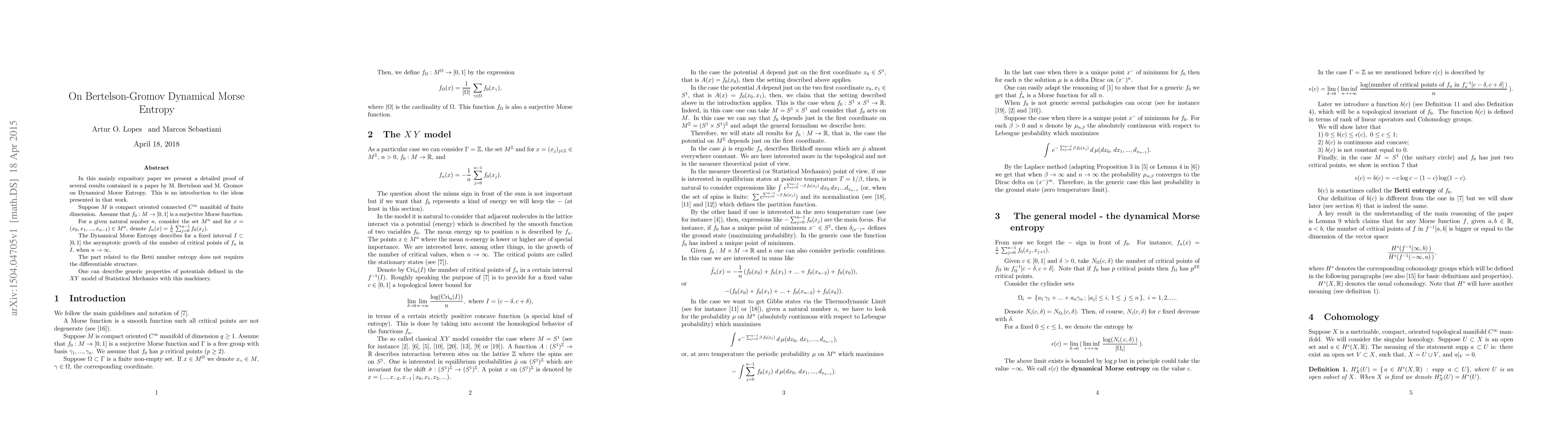 In this mainly expository paper we present a detailed proof of several results contained in a paper by M. Bertelson and M. Gromov on Dynamical Morse Entropy. This is an introduction to the ideas presented in that work. Suppose $M$ is compact oriented connected $C^\infty$ manifold of finite dimension. Assume that $f_0 :M \to [0,1]$ is a surjective Morse function. For a given natural number $n$, consider the set $M^n$ and for $x=(x_0,x_1,...,x_{n-1}) \in M^n$, denote $ f_n (x) = \frac{1}{n} \, \sum_{j=0}^{n-1} f_0 (x_j).$ The Dynamical Morse Entropy describes for a fixed interval $I\subset [0,1]$ the asymptotic growth of the number of critical points of $f_n$ in $I$, when $n \to \infty$. The part related to the Betti number entropy does not requires the differentiable structure. One can describe generic properties of potentials defined in the $XY$ model of Statistical Mechanics with this machinery.