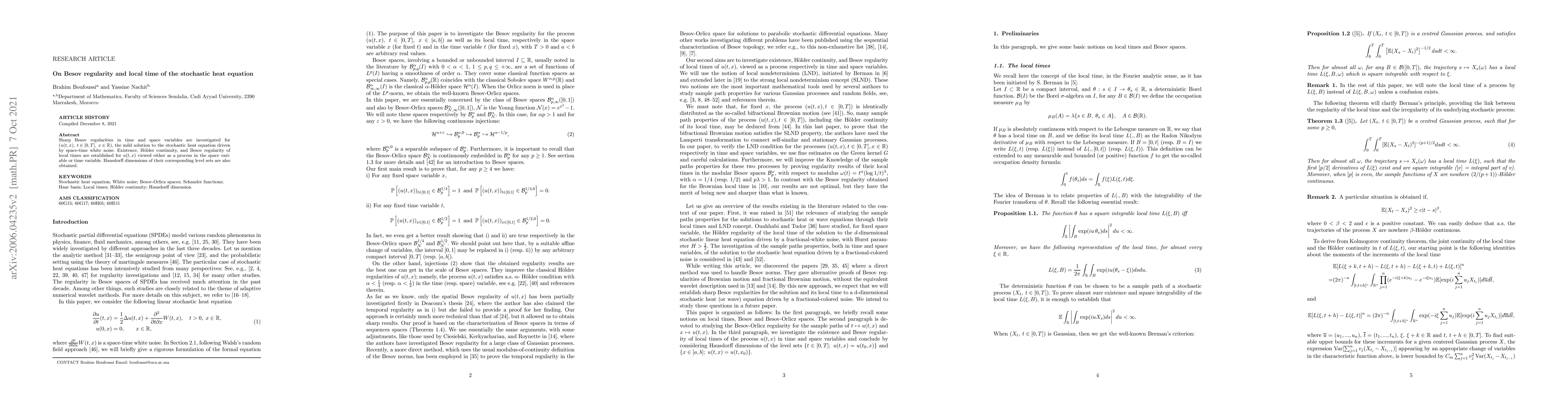This paper investigates the Besov regularity of the mild solution to the stochastic heat equation driven by space-time white noise, establishing its existence, Hölder continuity, and Besov regularity of local times. It also determines Hausdorff dimensions of the level sets corresponding to these local times.