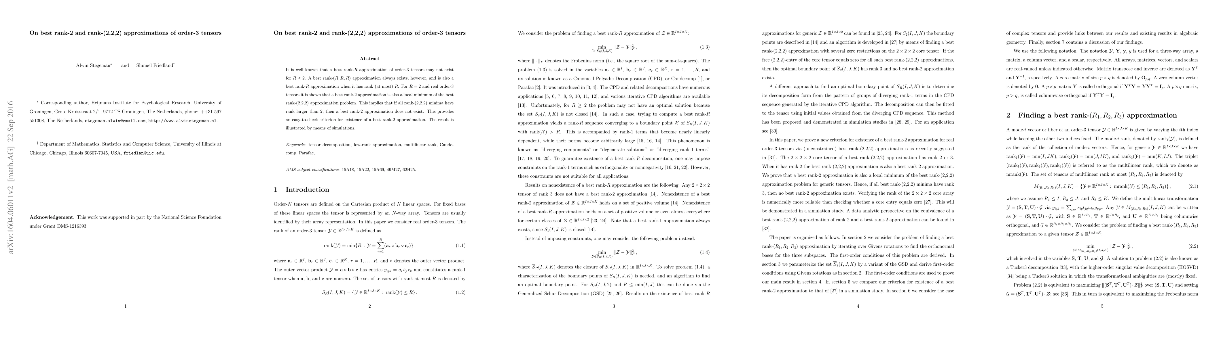 This paper investigates the existence of best rank-2 approximations for order-3 tensors, showing that such approximations are local minima of the best rank-(2,2,2) approximation problem. It provides a criterion for determining when a best rank-2 approximation does not exist, based on the ranks of all rank-(2,2,2) minima.