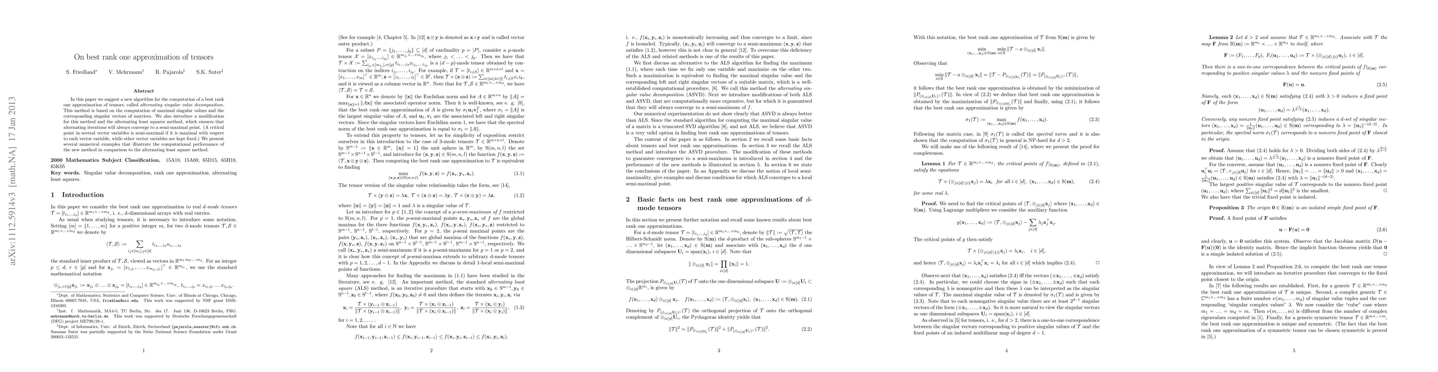 In this paper we suggest a new algorithm for the computation of a best rank one approximation of tensors, called alternating singular value decomposition. This method is based on the computation of maximal singular values and the corresponding singular vectors of matrices. We also introduce a modification for this method and the alternating least squares method, which ensures that alternating iterations will always converge to a semi-maximal point. (A critical point in several vector variables is semi-maximal if it is maximal with respect to each vector variable, while other vector variables are kept fixed.) We present several numerical examples that illustrate the computational performance of the new method in comparison to the alternating least square method.