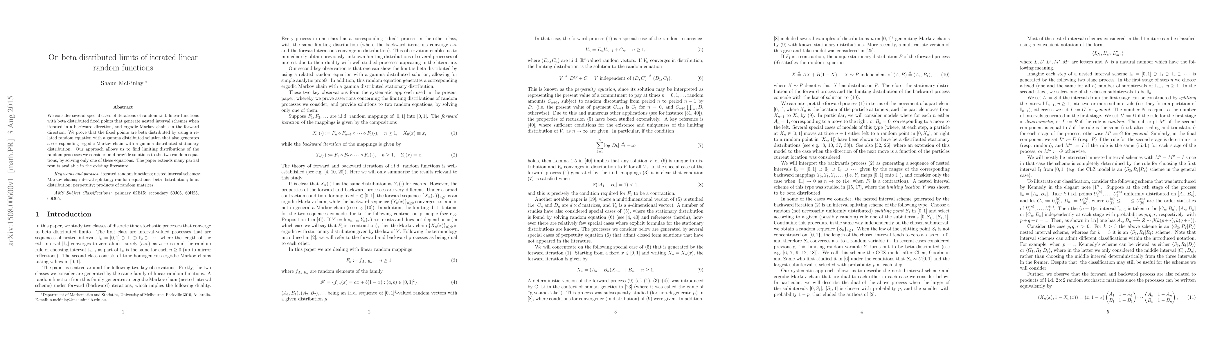 The paper employs a mathematical approach involving iterations of random i.i.d. linear functions with beta distributed fixed points, generating nested interval schemes in backward direction and ergodic Markov chains in forward direction. It uses a related random equation with a gamma distributed solution to prove the beta distribution of fixed points and find limiting distributions.
