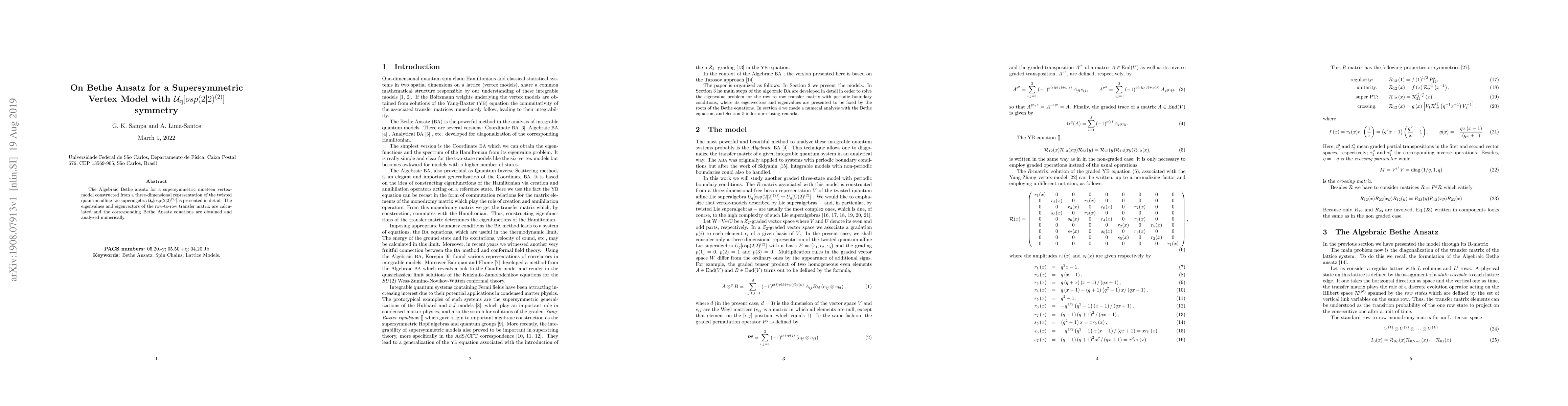 The Algebraic Bethe ansatz for a supersymmetric nineteen vertex-model constructed from a three-dimensional representation of the twisted quantum affine Lie superalgebra $\mathcal{U}_{q}[\mathrm{osp}(2|2)^{(2)}]$ is presented in detail. The eigenvalues and eigenvectors of the row-to-row transfer matrix are calculated and the corresponding Bethe Ansatz equations are obtained and analyzed numerically.
