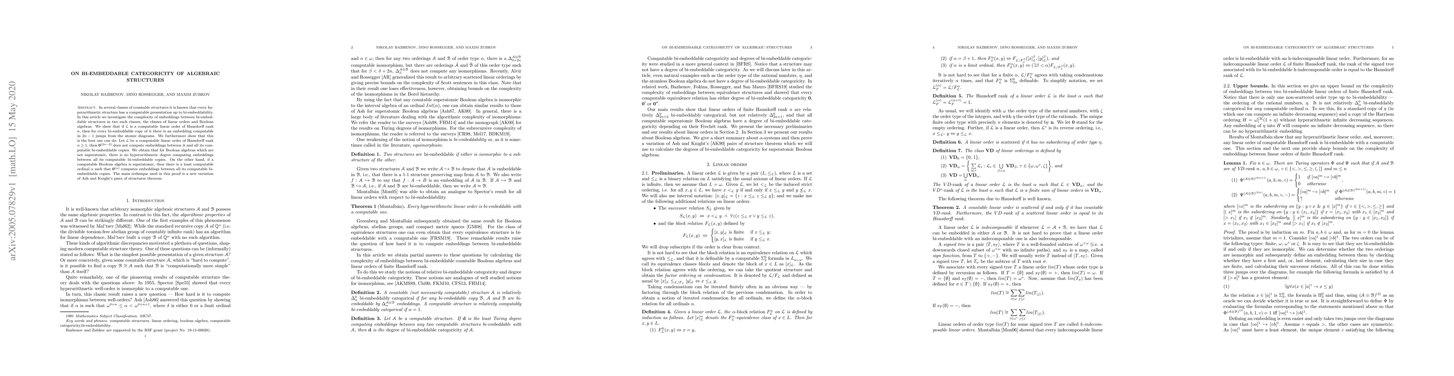 This paper explores the complexity of embeddings between bi-embeddable countable structures, focusing on linear orders and Boolean algebras. It demonstrates that embeddings between bi-embeddable linear orders require $2n-1$ jumps from atomic diagrams, and embeddings for superatomic Boolean algebras can be computed by $\mathbf 0^{(\alpha)}$ for some least computable ordinal $\alpha$.