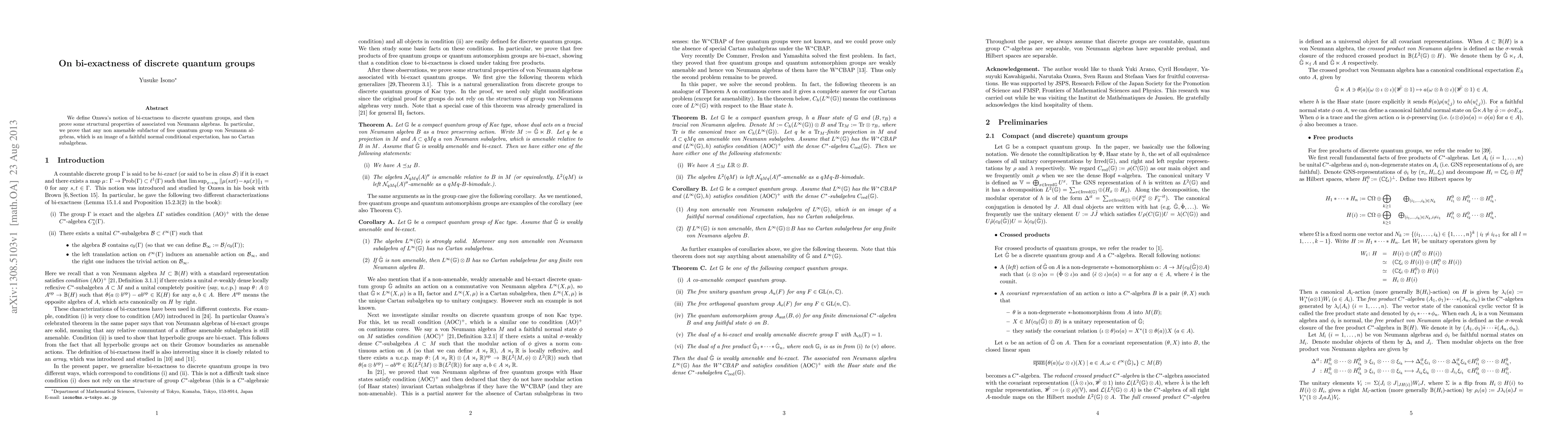 This paper extends Ozawa's notion of bi-exactness to discrete quantum groups, proving structural properties of their associated von Neumann algebras, specifically that non-amenable subfactors of free quantum group von Neumann algebras, which are images of faithful normal conditional expectations, lack Cartan subalgebras.
