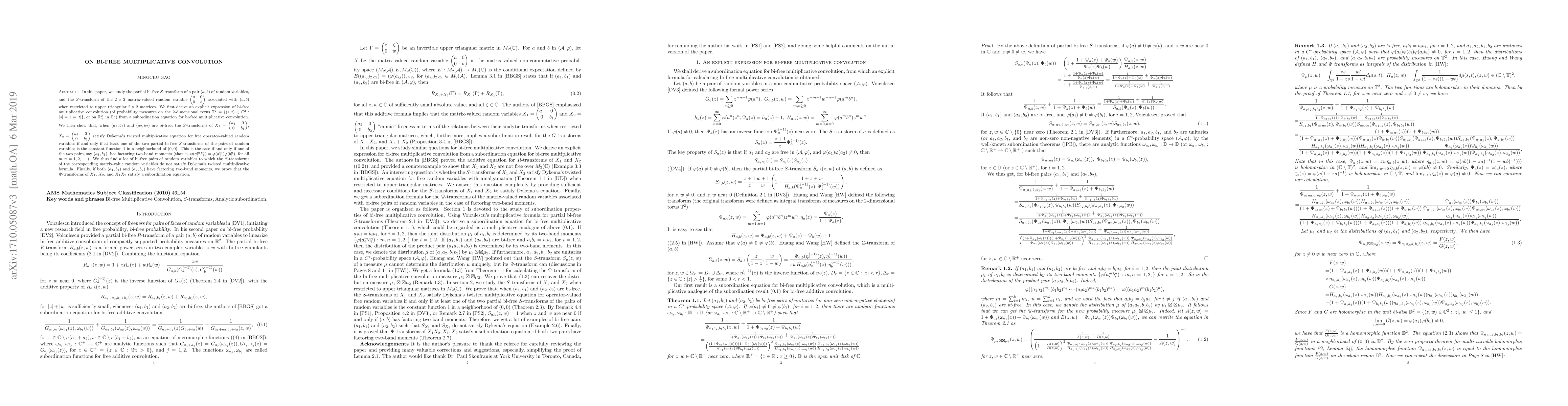 This paper explores the bi-free multiplicative convolution of random variables and their associated matrix-valued counterparts, deriving an explicit expression for the convolution from a subordination equation. It reveals that the $S$-transforms of matrix-valued random variables do not satisfy Dykema's twisted multiplicative equation unless one pair has factoring two-band moments, and proves a subordination equation for $\Psi$-transforms when both pairs have such moments.