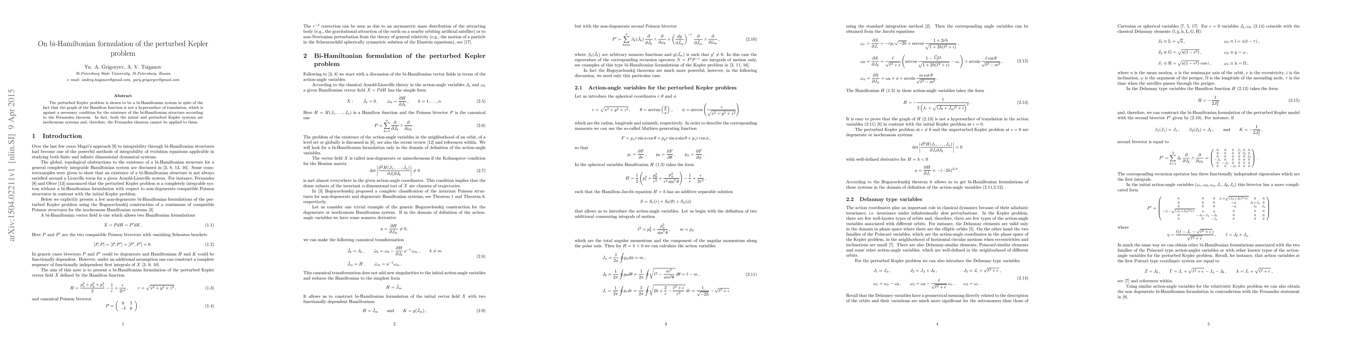 The perturbed Kepler problem is shown to be a bi-Hamiltonian system in spite of the fact that the graph of the Hamilton function is not a hypersurface of translation, which is against a necessary condition for the existence of the bi-Hamiltonian structure according to the Fernandes theorem. In fact, both the initial and perturbed Kepler systems are isochronous systems and, therefore, the Fernandes theorem cannot be applied to them.