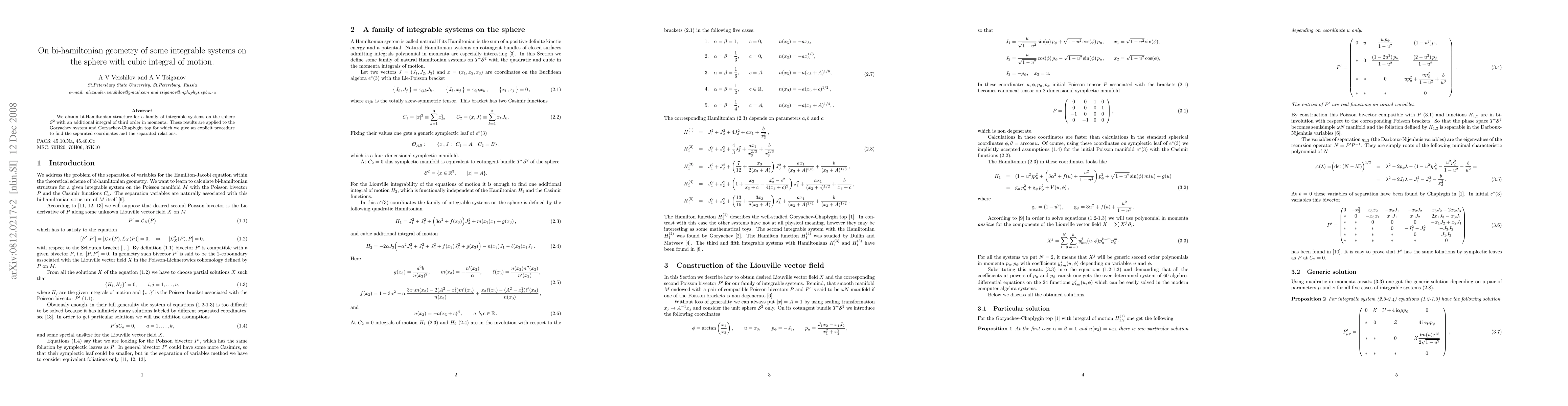 We obtain bi-Hamiltonian structure for a family of integrable systems on the sphere S with an additional integral of third order in momenta. These results are applied to the Goryachev system and Goryachev-Chaplygin top for which we give an explicit procedure to find the separated coordinates and the separated relations.