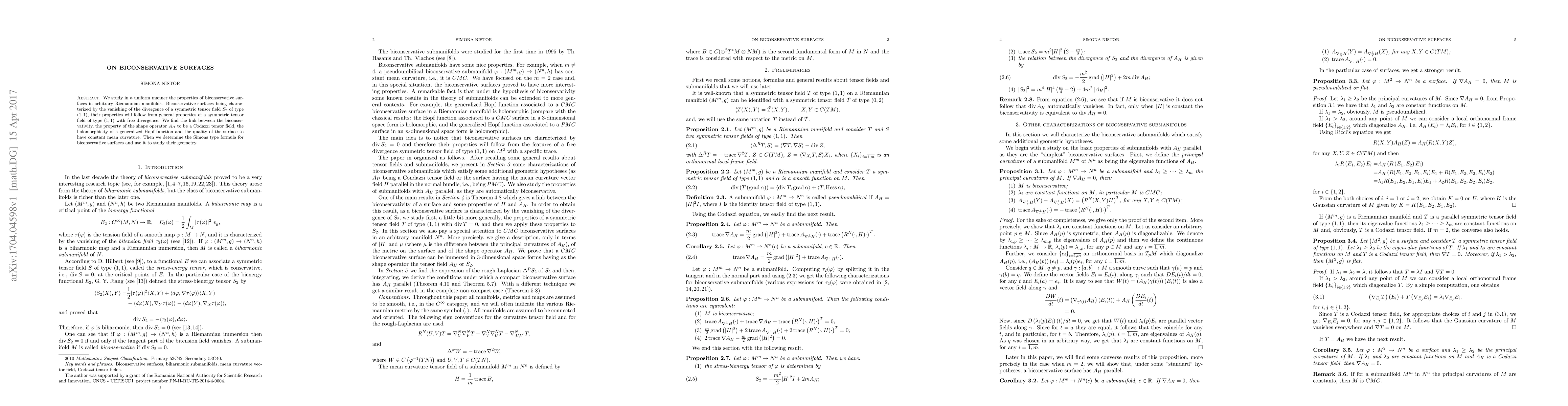 We study in a uniform manner the properties of biconservative surfaces in arbitrary Riemannian manifolds. Biconservative surfaces being characterized by the vanishing of the divergence of a symmetric tensor field $S_2$ of type $(1,1)$, their properties will follow from general properties of a symmetric tensor field of type $(1,1)$ with free divergence. We find the link between the biconservativity, the property of the shape operator $A_H$ to be a Codazzi tensor field, the holomorphicity of a generalized Hopf function and the quality of the surface to have constant mean curvature. Then we determine the Simons type formula for biconservative surfaces and use it to study their geometry.