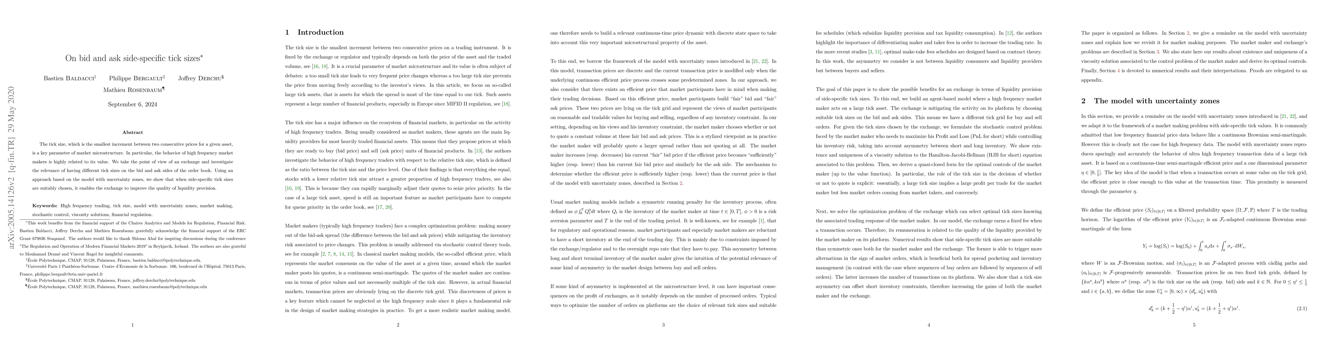 The tick size, which is the smallest increment between two consecutive prices for a given asset, is a key parameter of market microstructure. In particular, the behavior of high frequency market makers is highly related to its value. We take the point of view of an exchange and investigate the relevance of having different tick sizes on the bid and ask sides of the order book. Using an approach based on the model with uncertainty zones, we show that when side-specific tick sizes are suitably chosen, it enables the exchange to improve the quality of liquidity provision.