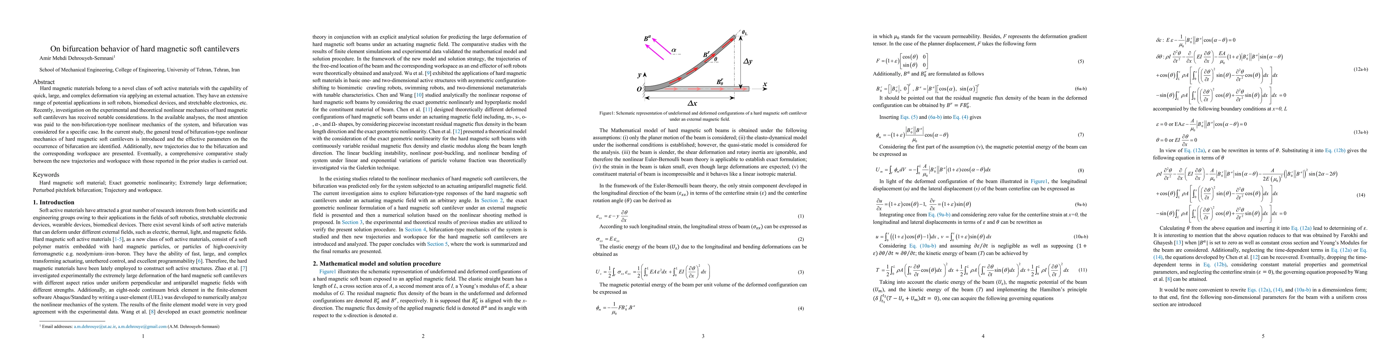 This paper investigates the bifurcation behavior of hard magnetic soft cantilevers, identifying effective parameters for bifurcation occurrence and presenting new trajectories and workspaces due to bifurcation. It also compares these findings with prior studies to highlight advancements in understanding nonlinear mechanics.