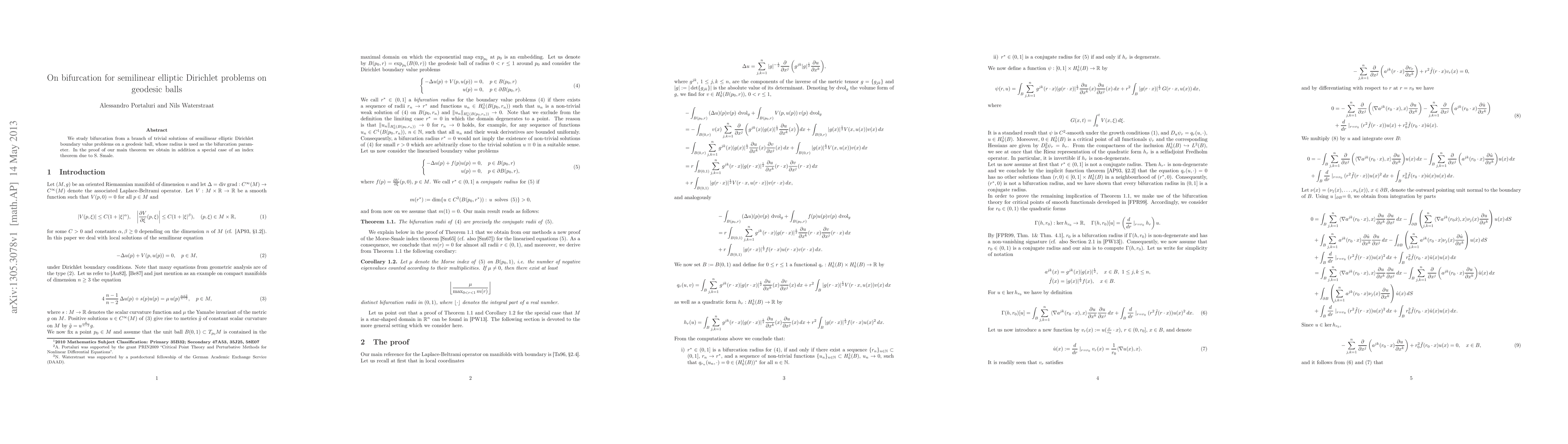 Summary: This paper investigates bifurcation phenomena in semilinear elliptic Dirichlet problems on geodesic balls, using the ball's radius as a bifurcation parameter, and proves a special case of S. Smale's index theorem in the process.