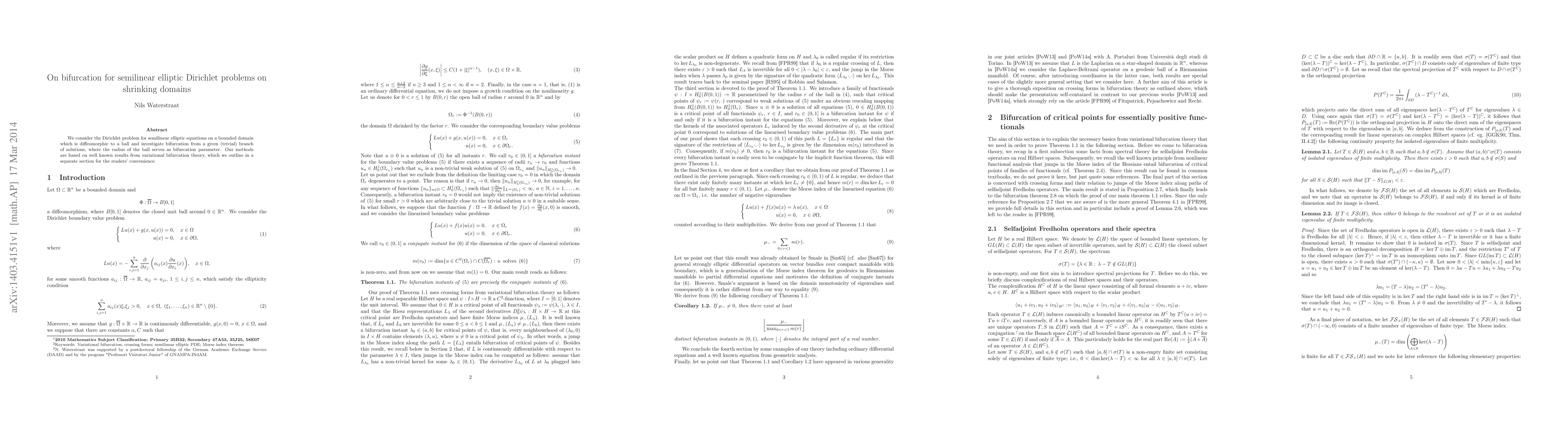 This paper studies bifurcation in semilinear elliptic Dirichlet problems on a shrinking domain, focusing on how solutions branch from a trivial solution as the domain's radius changes. The study employs variational bifurcation theory methods.