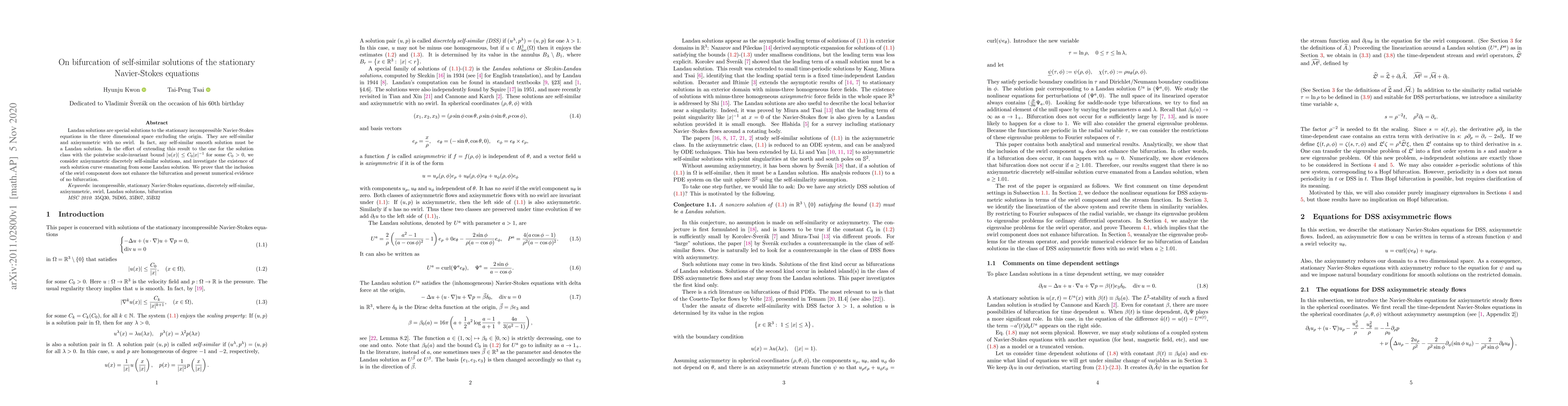 Landau solutions are special solutions to the stationary incompressible Navier-Stokes equations in the three dimensional space excluding the origin. They are self-similar and axisymmetric with no swirl. In fact, any self-similar smooth solution must be a Landau solution. In the effort of extending this result to the one for the solution class with the pointwise scale-invariant bound $|u(x)|\leq C_0|x|^{-1}$ for some $C_0>0$, we consider axisymmetric discretely self-similar solutions, and investigate the existence of such solution curve emanating from some Landau solution. We prove that the inclusion of the swirl component does not enhance the bifurcation and present numerical evidence of no bifurcation.