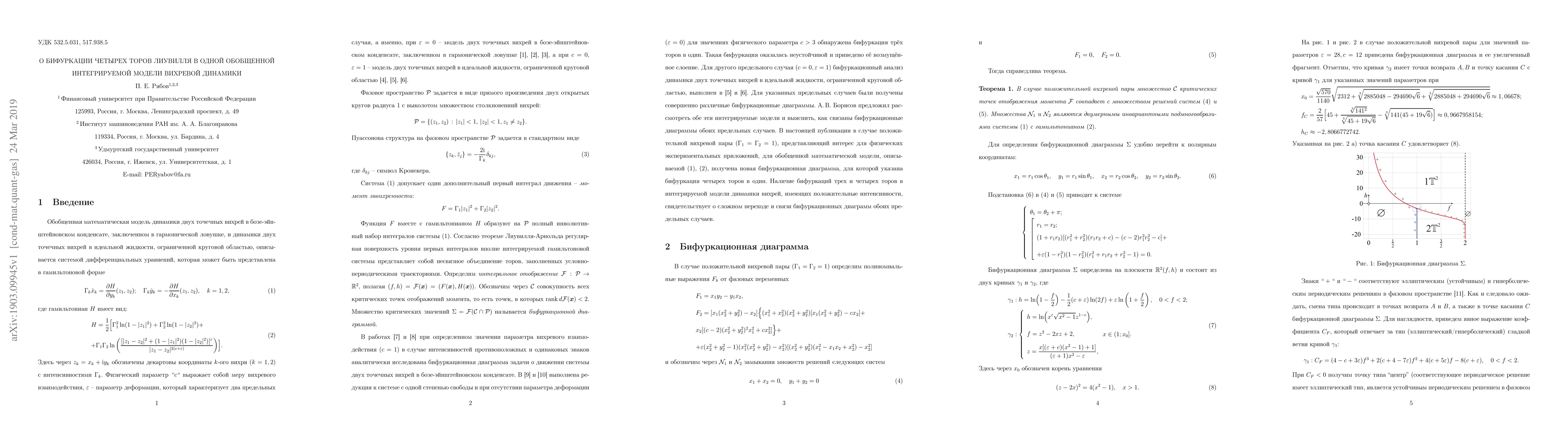This paper explores the bifurcation of four Liouville tori in a generalized integrable model of vortex dynamics, focusing on two point vortices in Bose-Einstein condensates and ideal fluids. It presents a new bifurcation diagram indicating the transition of four tori into one, highlighting complex transitions and connections between different cases.