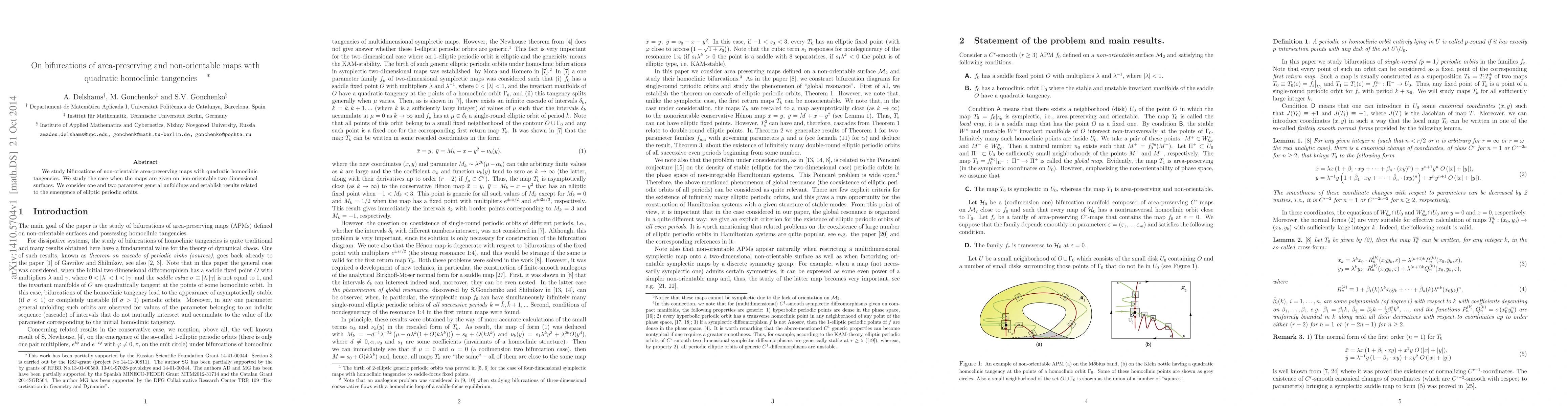Summary: This paper investigates the bifurcations of non-orientable area-preserving maps on two-dimensional surfaces, focusing on quadratic homoclinic tangencies, and explores the emergence of elliptic periodic orbits through one and two parameter unfoldings.