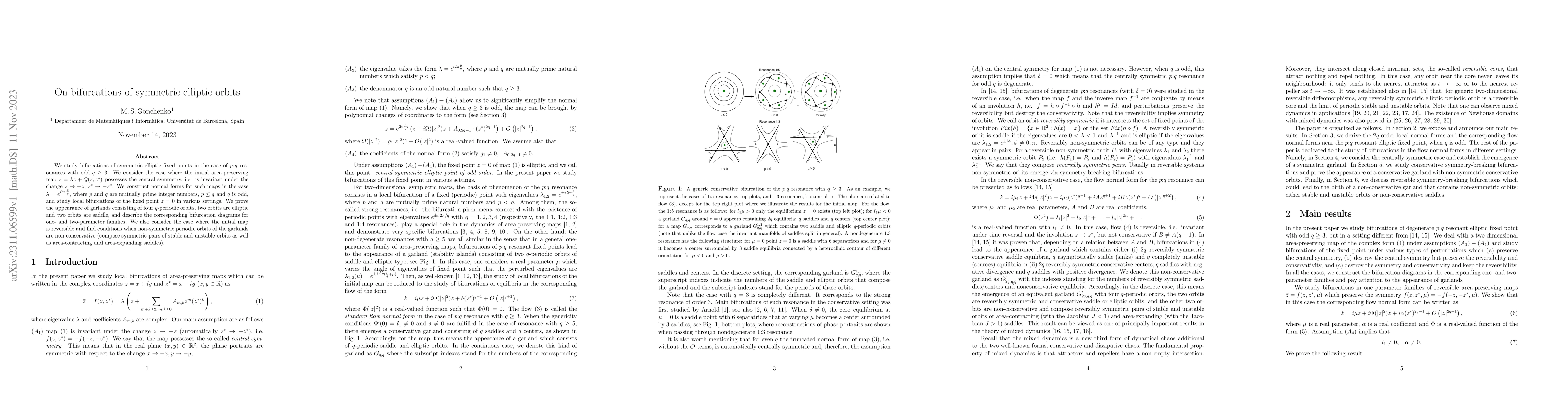 Development of normal forms and bifurcation diagrams for symmetric elliptic orbits under p:q resonances, extending previous work on conservative and reversible systems.