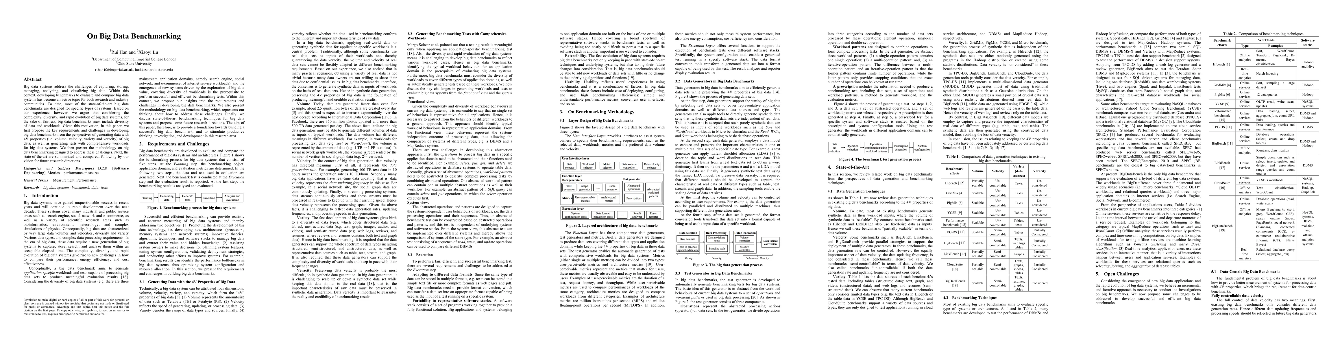 This paper discusses the development of comprehensive benchmarks for big data systems, emphasizing the need for diversity in data and workloads to ensure fairness. It proposes a methodology addressing the 4V properties of big data and compares existing benchmarks, outlining future research directions.