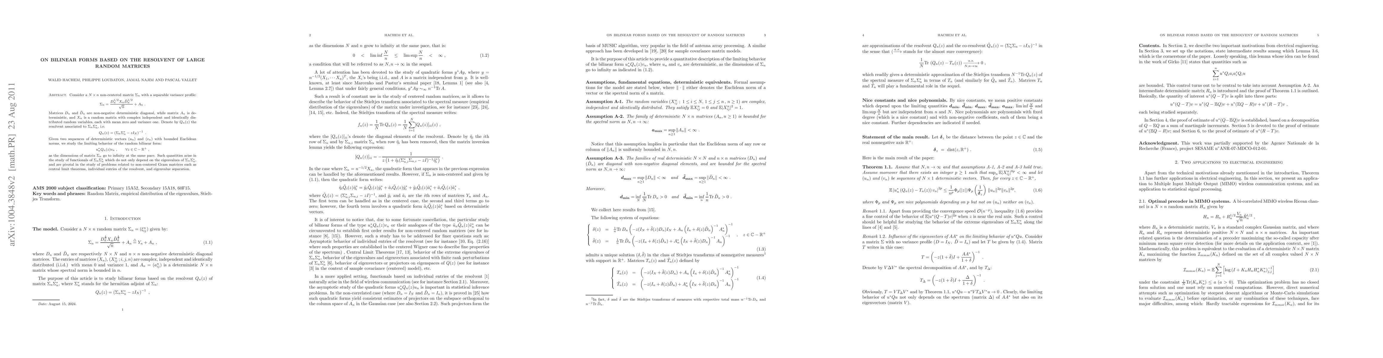 This research paper studies the limiting behavior of a random bilinear form based on the resolvent of large random matrices, with implications for central limit theorems and eigenvalue separation in non-centered Gram matrices.