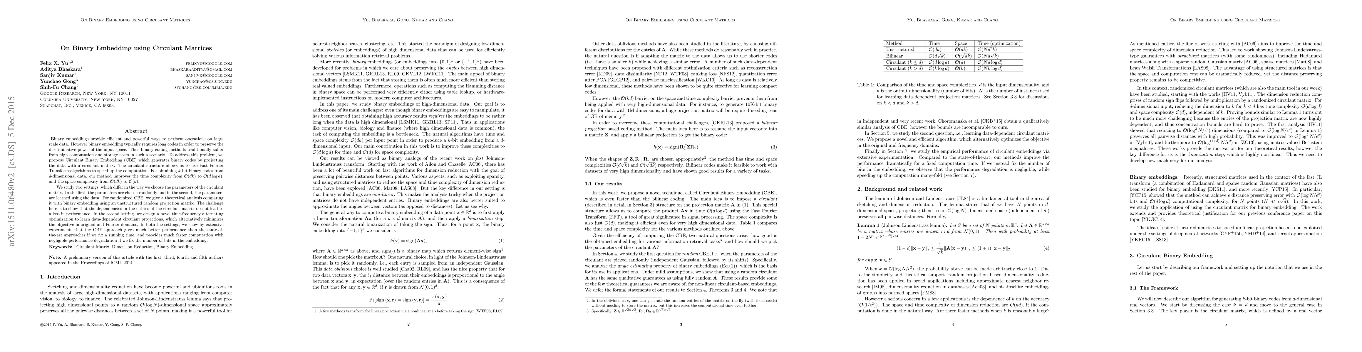 This paper proposes Circulant Binary Embedding (CBE) to efficiently generate binary codes from high-dimensional data using circulant matrices, which leverages Fast Fourier Transforms to reduce computational complexity from O(dk) to O(d log d). It explores both randomized and learned parameter settings for the circulant matrix, demonstrating superior performance compared to state-of-the-art methods in both scenarios.