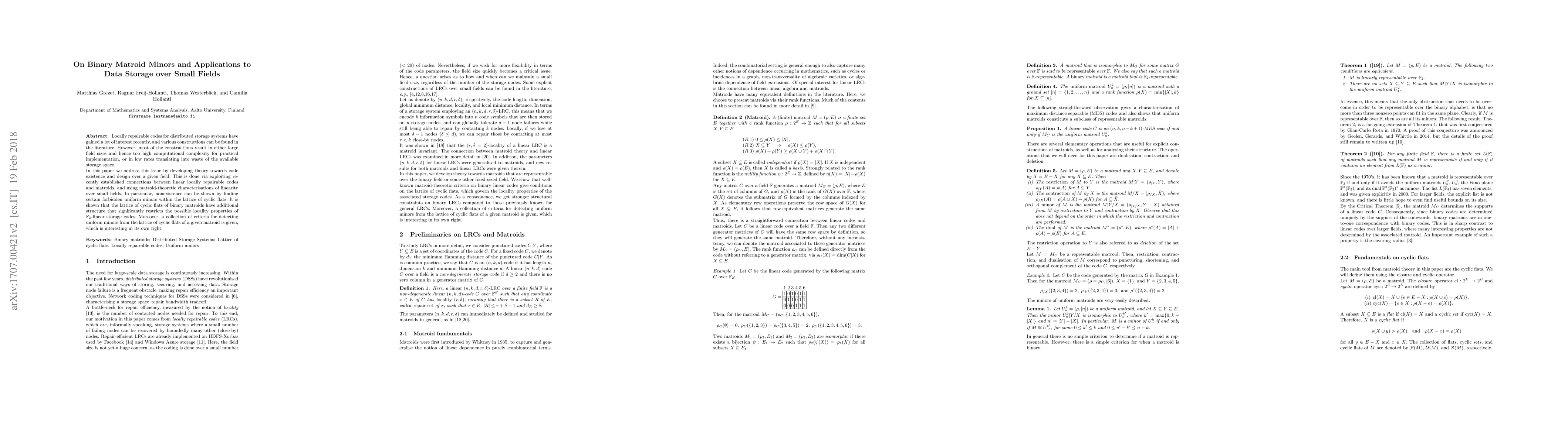 Researchers developed theory to design locally repairable codes over small fields for distributed storage systems, leveraging connections between linear codes and matroids to overcome size and complexity limitations.