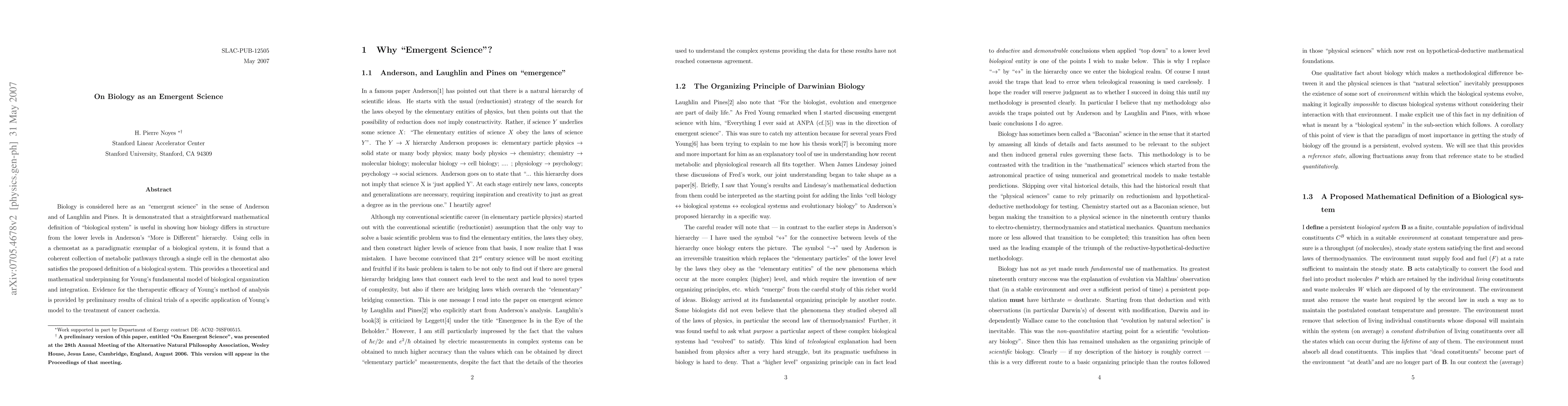 Biology is considered here as an "emergent science" in the sense of Anderson and of Laughlin and Pines. It is demonstrated that a straightforward mathematical definition of "biological system" is useful in showing how biology differs in structure from the lower levels in Anderson's "More is Different" hierarchy. Using cells in a chemostat as a paradigmatic exemplar of a biological system, it is found that a coherent collection of metabolic pathways through a single cell in the chemostat also satisfies the proposed definition of a biological system. This provides a theoretical and mathematical underpinning for Young's fundamental model of biological organization and integration. Evidence for the therapeutic efficacy of Young's method of analysis is provided by preliminary results of clinical trials of a specific application of Young's model to the treatment of cancer cachexia.