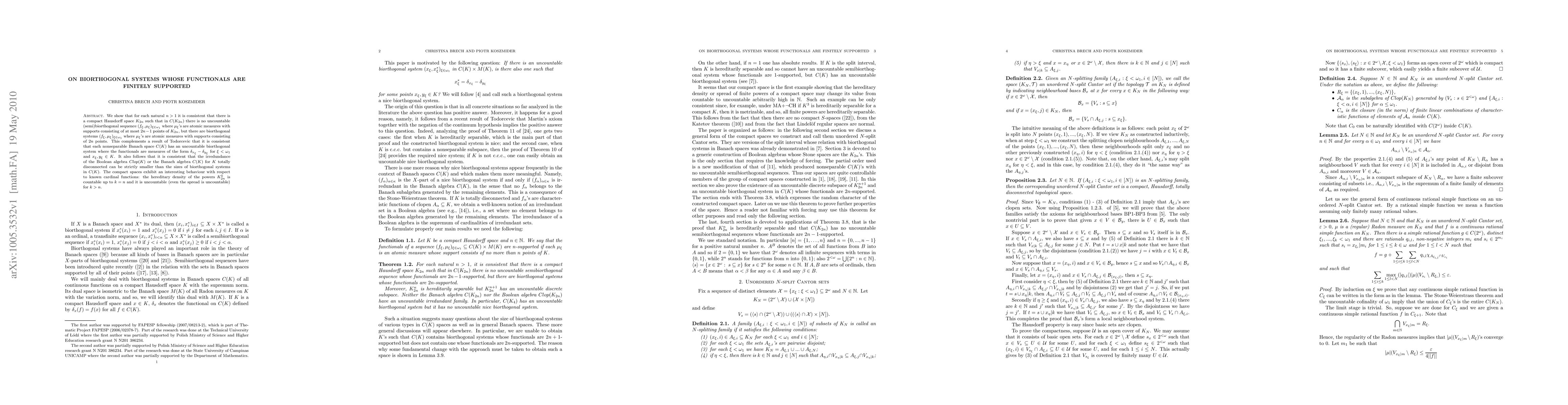 This paper demonstrates the consistency of the existence of a compact Hausdorff space $K_{2n}$ where no uncountable biorthogonal sequence in $C(K_{2n})$ has functionals with support of at most $2n-1$ points, contrasting with the presence of biorthogonal systems with $2n$ support points. This finding complements Todorcevic's result on biorthogonal systems in nonseparable Banach spaces.