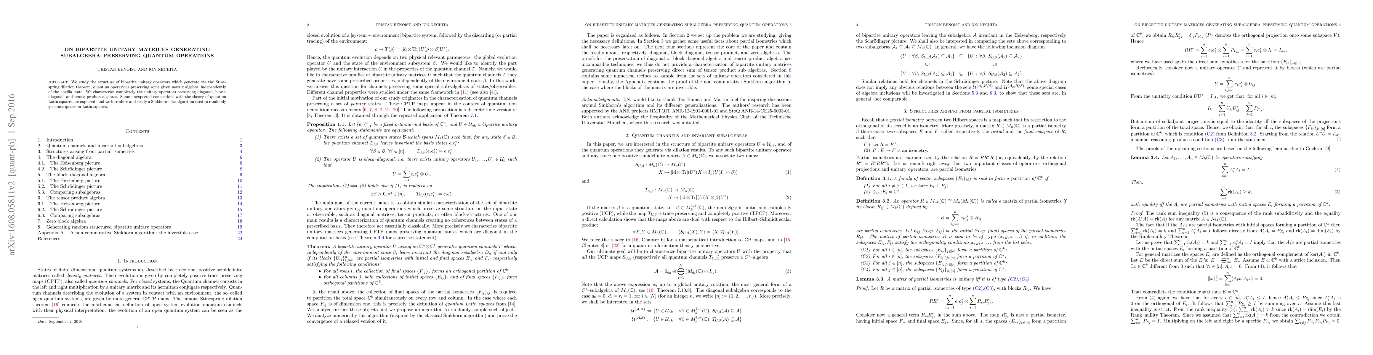 This paper characterizes bipartite unitary operators that generate subalgebra-preserving quantum operations, focusing on diagonal, block-diagonal, and tensor product algebras. It also explores connections to quantum Latin squares and introduces a Sinkhorn-like algorithm for generating quantum Latin squares.