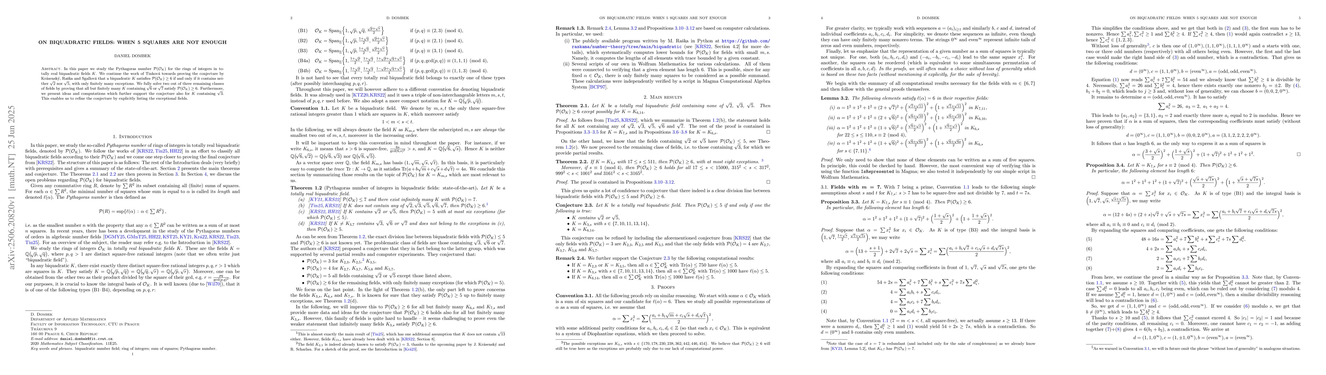 In this paper we study the Pythagoras number $\mathcal{P}(\mathcal{O}_K)$ for the rings of integers in totally real biquadratic fields $K$. We continue the work of Tinkov\'a towards proving the conjecture by Kr\'asensk\'y, Ra\v{s}ka and Sgallov\'a that a biquadratic $K$ satisfies $\mathcal{P}(\mathcal{O}_K)\geq 6$ if and only if it contains neither $\sqrt{2}$ nor $\sqrt{5}$, with only finitely many exceptions. We fully solve two out of three remaining classes of fields by proving that all but finitely many $K$ containing $\sqrt{6}$ or $\sqrt{7}$ satisfy $\mathcal{P}(\mathcal{O}_K)\geq 6$. Furthermore, we present ideas and computations which further support the conjecture also for $K$ containing $\sqrt{3}$. This enables us to refine the conjecture by explicitly listing the exceptional fields.