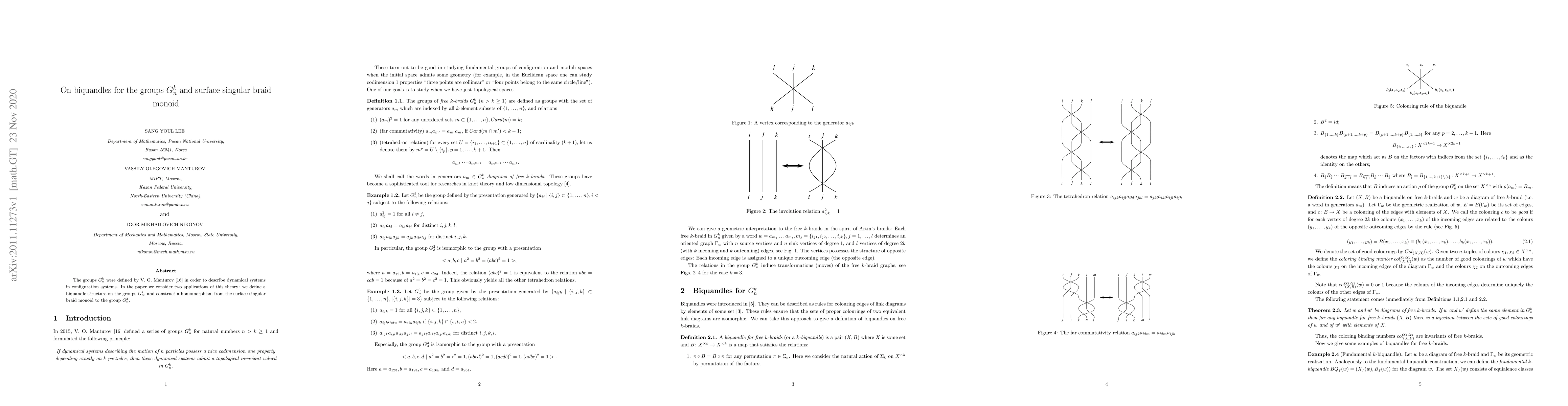 The groups $G_n^k$ were defined by V. O. Manturov in order to describe dynamical systems in configuration systems. In the paper we consider two applications of this theory: we define a biquandle structure on the groups $G_n^k$, and construct a homomorphism from the surface singular braid monoid to the group $G_n^2$.
