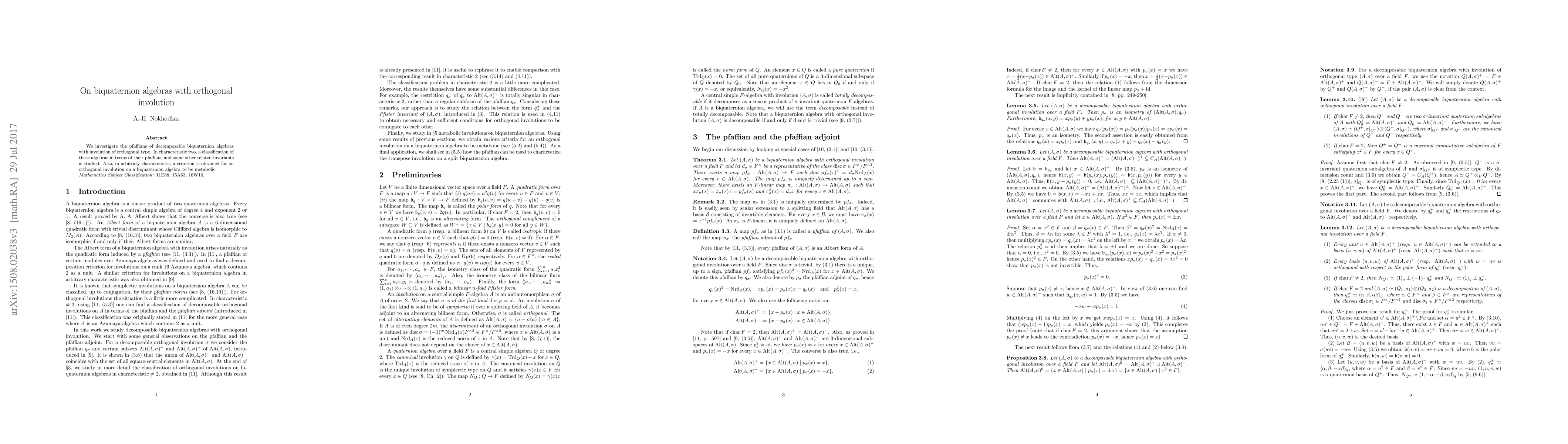 We investigate the pfaffians of decomposable biquaternion algebras with involution of orthogonal type. In characteristic two, a classification of these algebras in terms of their pfaffians and some other related invariants is studied. Also, in arbitrary characteristic, a criterion is obtained for an orthogonal involution on a biquaternion algebra to be metabolic.
