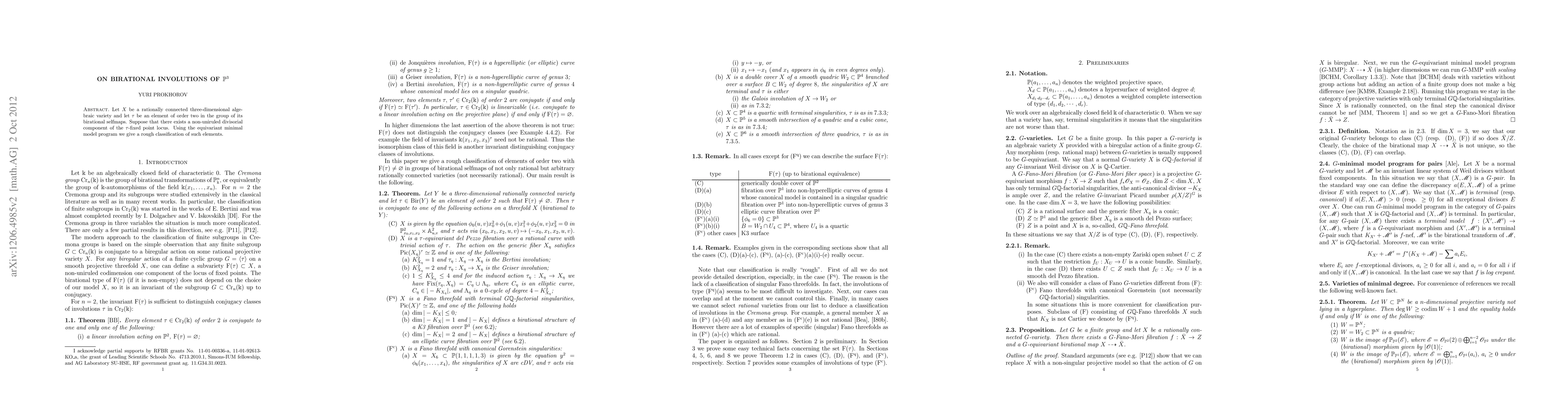 Let $X$ be a rationally connected three-dimensional algebraic variety and let $\tau$ be an element of order two in the group of its birational selfmaps. Suppose that there exists a non-uniruled divisorial component of the $\tau$-fixed point locus. Using the equivariant minimal model program we give a rough classification of such elements.