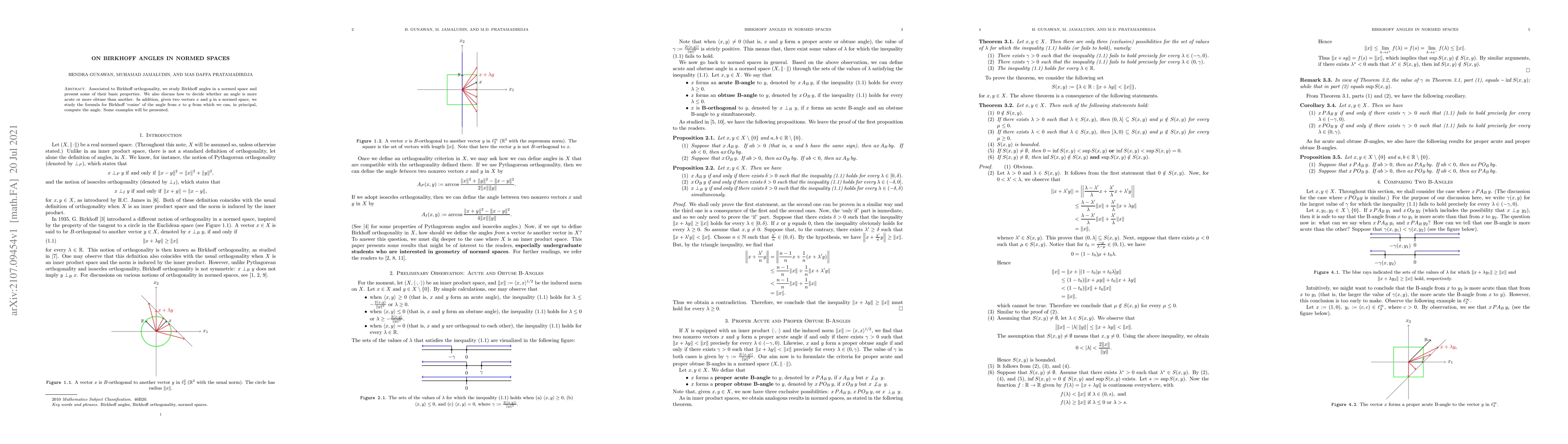 This paper investigates Birkhoff angles in normed spaces, exploring their properties and providing a formula for computing the Birkhoff cosine of an angle between two vectors. It also discusses methods to compare the acuteness or obtuseness of different angles.