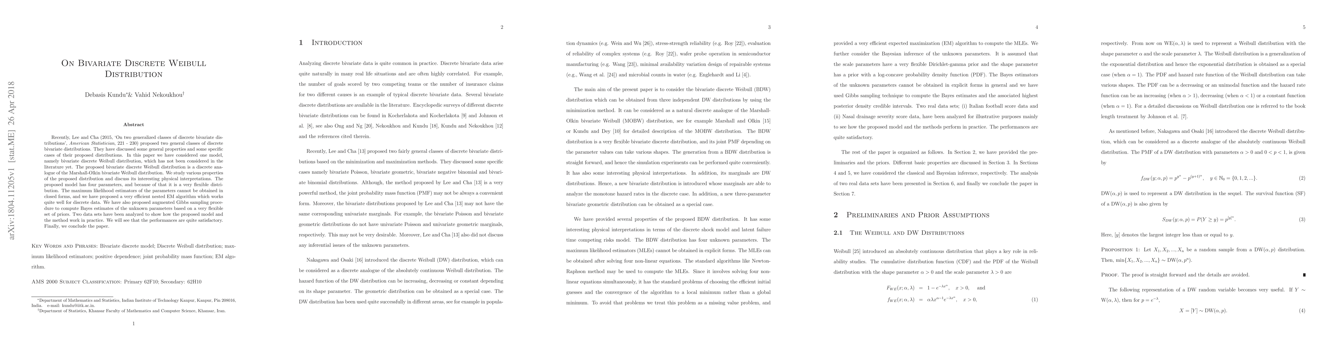 This paper introduces a new bivariate discrete Weibull distribution, a discrete analogue of the Marshall-Olkin bivariate Weibull distribution, with four parameters offering high flexibility. The authors propose methods for parameter estimation, including a nested EM algorithm and augmented Gibbs sampling, and demonstrate the model's effectiveness through practical data analysis.