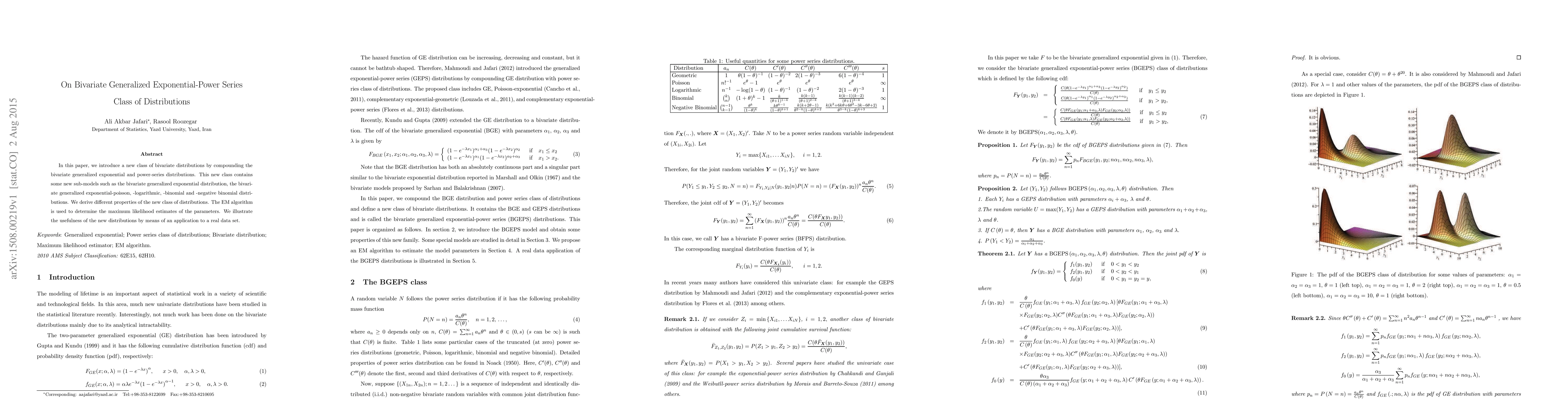 This paper introduces a new class of bivariate distributions by combining the bivariate generalized exponential and power-series distributions, deriving properties and employing the EM algorithm for parameter estimation. An application to a real dataset demonstrates the practical utility of the proposed distributions.