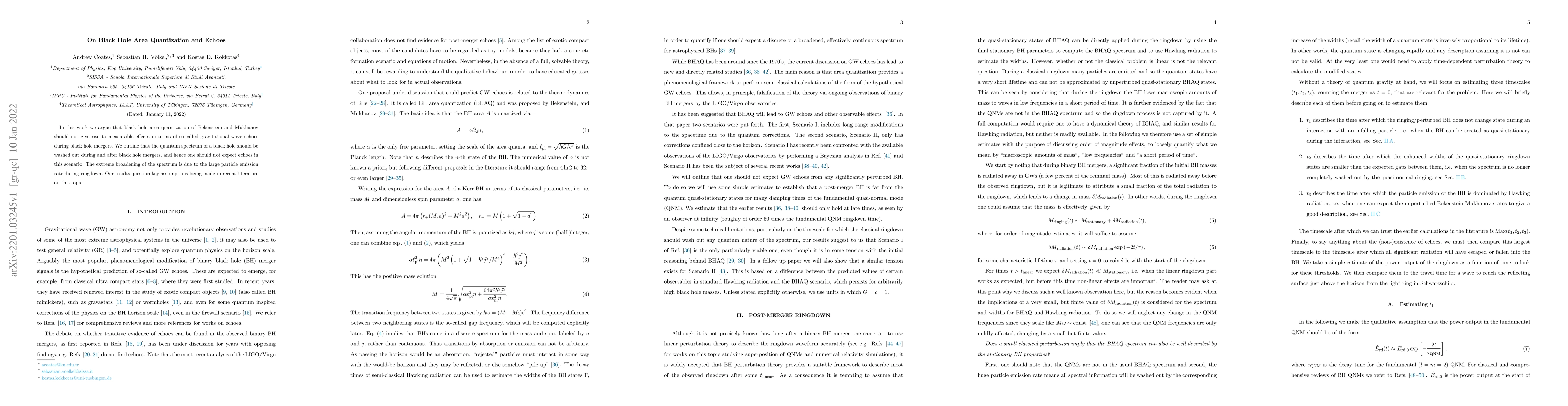 In this work we argue that black hole area quantization of Bekenstein and Mukhanov should not give rise to measurable effects in terms of so-called gravitational wave echoes during black hole mergers. We outline that the quantum spectrum of a black hole should be washed out during and after black hole mergers, and hence one should not expect echoes in this scenario. The extreme broadening of the spectrum is due to the large particle emission rate during ringdown. Our results question key assumptions being made in recent literature on this topic.