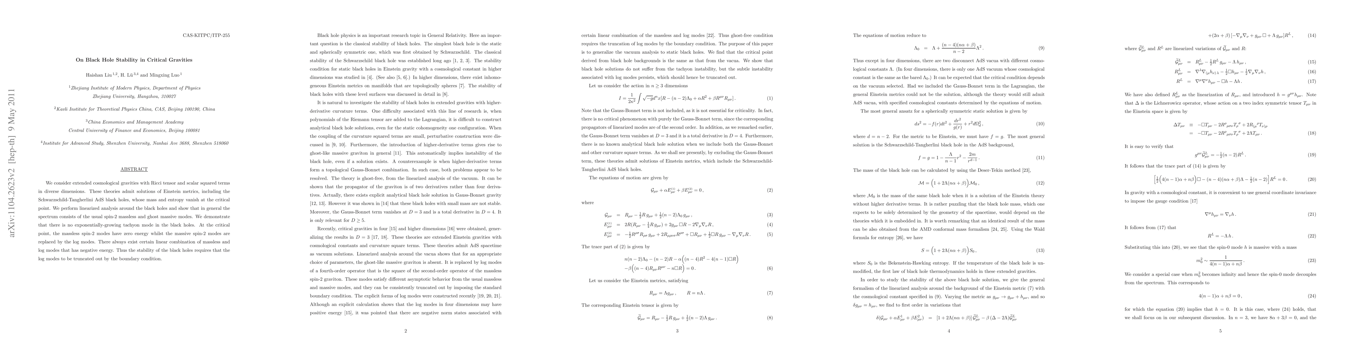 We consider extended cosmological gravities with Ricci tensor and scalar squared terms in diverse dimensions. These theories admit solutions of Einstein metrics, including the Schwarzschild-Tangherlini AdS black holes, whose mass and entropy vanish at the critical point. We perform linearized analysis around the black holes and show that in general the spectrum consists of the usual spin-2 massless and ghost massive modes. We demonstrate that there is no exponentially-growing tachyon mode in the black holes. At the critical point, the massless spin-2 modes have zero energy whilst the massive spin-2 modes are replaced by the log modes. There always exist certain linear combination of massless and log modes that has negative energy. Thus the stability of the black holes requires that the log modes to be truncated out by the boundary condition.