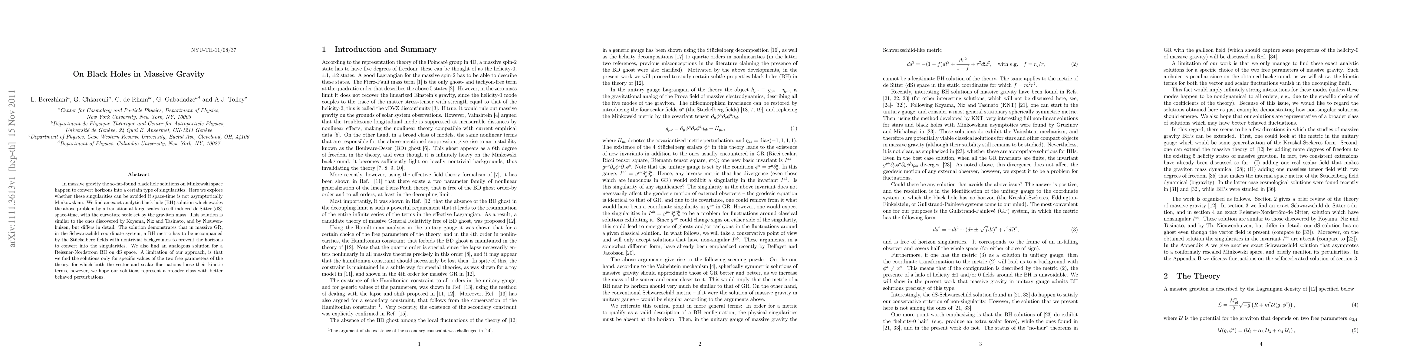 In massive gravity the so-far-found black hole solutions on Minkowski space happen to convert horizons into a certain type of singularities. Here we explore whether these singularities can be avoided if space-time is not asymptotically Minkowskian. We find an exact analytic black hole (BH) solution which evades the above problem by a transition at large scales to self-induced de Sitter (dS) space-time, with the curvature scale set by the graviton mass. This solution is similar to the ones discovered by Koyama, Niz and Tasinato, and by Nieuwenhuizen, but differs in detail. The solution demonstrates that in massive GR, in the Schwarzschild coordinate system, a BH metric has to be accompanied by the St\"uckelberg fields with nontrivial backgrounds to prevent the horizons to convert into the singularities. We also find an analogous solution for a Reissner-Nordstr\"om BH on dS space. A limitation of our approach, is that we find the solutions only for specific values of the two free parameters of the theory, for which both the vector and scalar fluctuations loose their kinetic terms, however, we hope our solutions represent a broader class with better behaved perturbations.