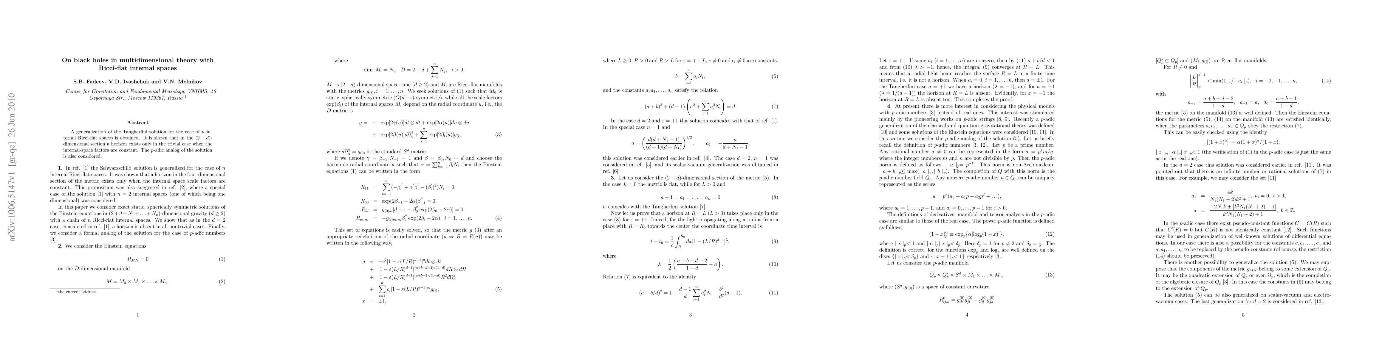 A generalization of the Tangherlini solution for the case of n internal Ricci-flat spaces is obtained. It is shown that in the (2+d)-dimensional section a horizon exists only in the trivial case when the internal-space factors are constant. The p-adic analog of the solution is also considered.