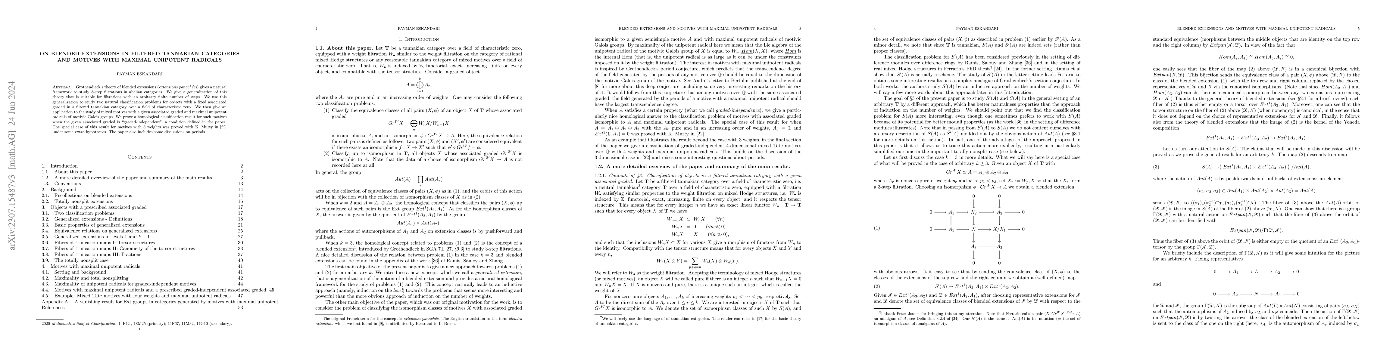 Title: On blended extensions in filtered tannakian categories and motives with maximal unipotent radicals Summary: This paper generalizes Grothendieck's theory of blended extensions to handle filtrations with an arbitrary number of steps and applies this to classify objects in filtered tannakian categories, providing a homological classification result for mixed motives with maximal unipotent radicals under certain conditions.