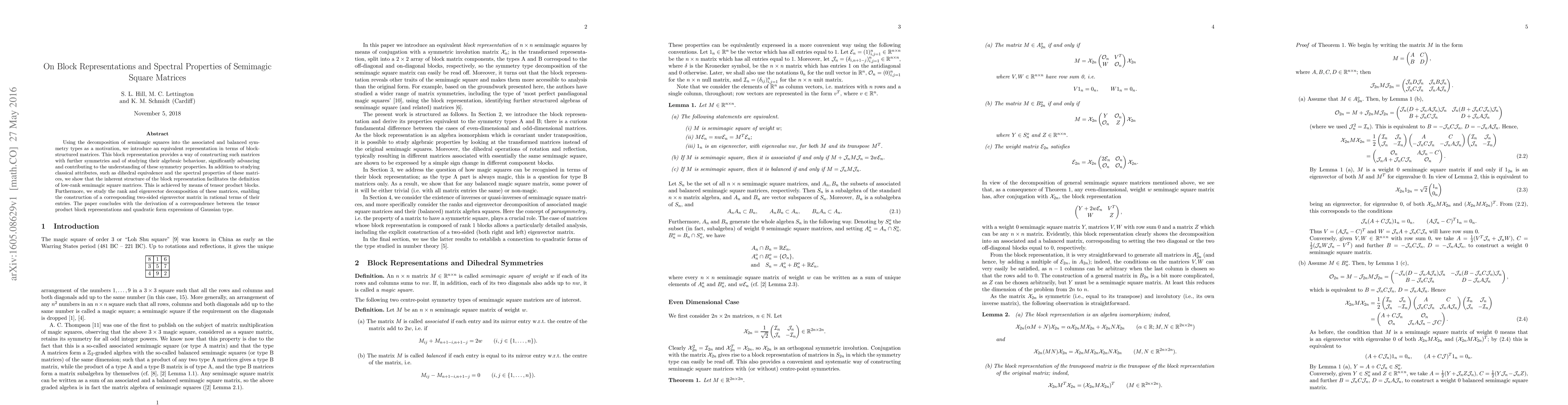 Using the decomposition of semimagic squares into the associated and balanced symmetry types as a motivation, we introduce an equivalent representation in terms of block-structured matrices. This block representation provides a way of constructing such matrices with further symmetries and of studying their algebraic behaviour, significantly advancing and contributing to the understanding of these symmetry properties. In addition to studying classical attributes, such as dihedral equivalence and the spectral properties of these matrices, we show that the inherent structure of the block representation facilitates the definition of low-rank semimagic square matrices. This is achieved by means of tensor product blocks. Furthermore, we study the rank and eigenvector decomposition of these matrices, enabling the construction of a corresponding two-sided eigenvector matrix in rational terms of their entries. The paper concludes with the derivation of a correspondence between the tensor product block representations and quadratic form expressions of Gaussian type.