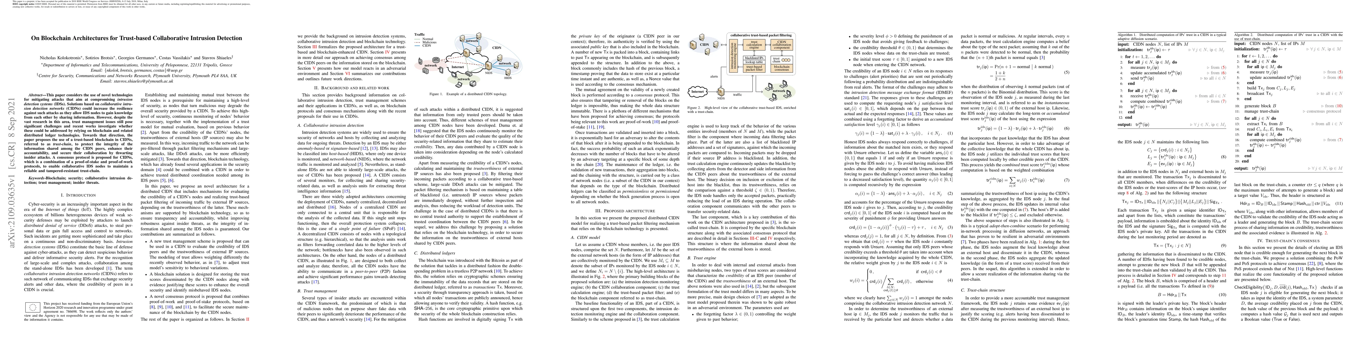 This paper proposes a trust-based blockchain called trust-chain for collaborative intrusion detection networks (CIDNs) to enhance integrity, accountability, and thwart insider attacks, using a consensus protocol combining proof-of-stake and proof-of-work to maintain a secure and reliable network.